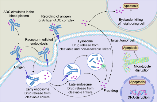 Often likened to “magic bullets”, ADCs consist of three key components: a highly specific mAb, a potent cytotoxic drug payload, and a linker that attaches the payload to the mAb. Their mechanism of action can be broken down into several key steps. The mAbs on the ADC are designed to recognize and bind to tumor-associated antigens present on the surface of the cancer cells. These antigens are either absent or minimally present on normal cells, ensuring that the drug is selectively directed to the tumor cells. Upon binding to the target antigen, the ADC is internalized by the cancer cell through a process known as endocytosis. Once the ADC is brought into the cell within an endosome, it is typically transported to the lysosome. The acidic environment and protein hydrolases within the lysosomes either break down the linker or degrade the ADC, causing the release of its payload. The release of the cytotoxic drug, such as microtubule inhibitor or DNA-damaging compound, disrupts critical cellular processes and leads to cell death. In addition to their direct cytotoxic effects, some ADCs exhibit bystander effects, mediated by the passive diffusion of the cytotoxic payload into neighboring cells. ADCs with bystander effects can kill not only antigen-positive cancer cells but also indirectly kill antigen-negative cancer cells. These bystander effects significantly enhance the therapeutic efficacy of ADCs, particularly in tumors with heterogenous antigen expression.
