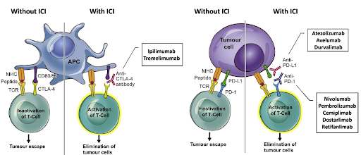 Immune checkpoint proteins are regulatory proteins that act like switches, preventing immune cells from attacking normal, healthy cells. The programmed cell death protein 1 (PD-1) and cytotoxic T-lymphocyte-associated protein 4 (CTLA-4) are the two most well-known immune checkpoint proteins that play an important role in tumor immune evasion. Under normal conditions, these proteins act as negative regulators of immune responses, preventing excessive inflammation and autoimmunity. However, many cancer cells exploit these proteins to evade detection and destruction by the immune system. Cancer cells can express ligands such as programmed death-ligand 1 (PD-L1), which binds to PD-1 on T-cells and inhibit their activity, allowing the tumor to evade immune detection and grow unchecked. Additionally, tumor cells can release signals that promote the expression of CTLA-4 and lymphocyte activation gene-3 (LAG-3) on T-cells, leading to immune suppression and further hindering the anti-tumor immune response. ICIs are designed to block these immune checkpoint proteins, enabling the T-cells to recognize and attack cancer cells more effectively. To date, many ICIs have been approved by the U.S. Food and Drug Administration (FDA) for various cancers, such as PD-1 inhibitors (nivolumab, pembrolizumab, cemiplimab, dostarlimab, and retifanlimab), PD-L1 inhibitors (atezolizumab, avelumab, and durvalimab), CTLA-4 inhibitors (ipilimumab and tremelimumab), and LAG-3 inhibitor (relatlimab).
